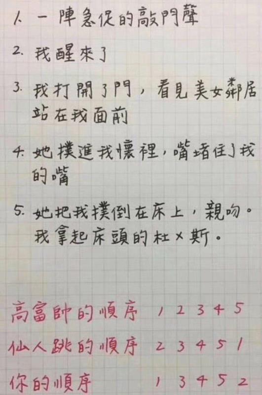 1.一阵急促的敲门声;2.我醒来了;3.我打开了门,看见美女邻居站在我面前;
