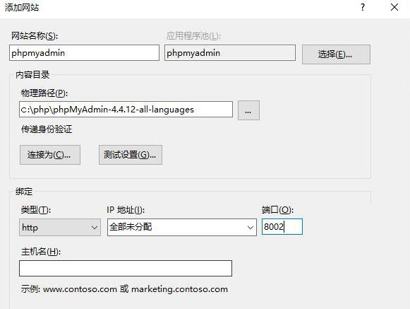 把物理路径指向我们上一步新建site1网站目录,物理路径指向我们刚上面新建的文件夹,端口处默认80,主机名处填写你的域名。我这是服务器上演示,没绑定域名,有一个默认的站点,不绑定域名的话,它会提示端口被占用,你可以删除,也可以在默认站点上修改物理路径为你新建的站点路径,这里我是新建一个,没有删除默认站点,所以得把端口设置为8001。