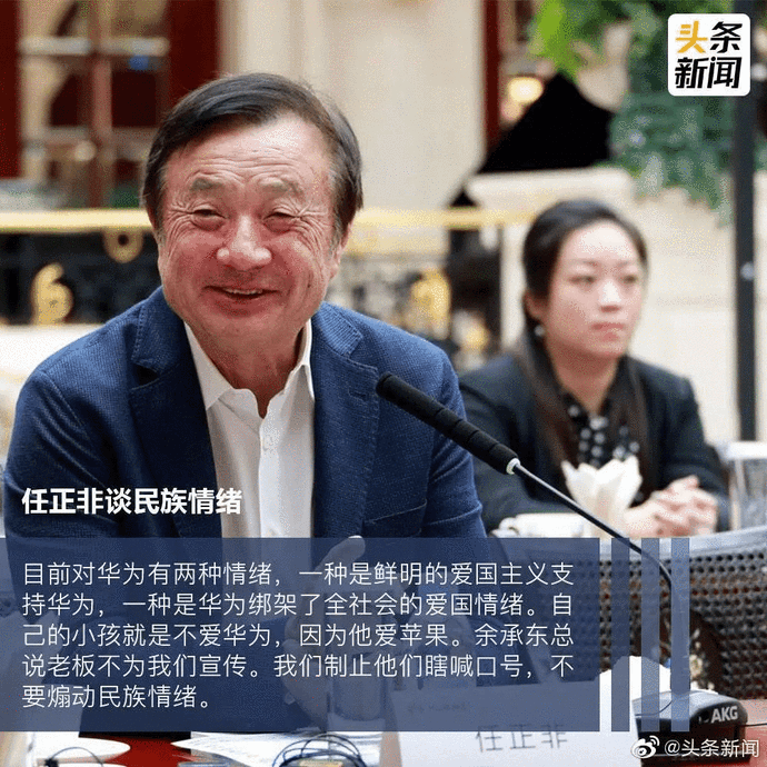 目前对华为有两种情绪,一种是鲜明的爱国主义支持华为,一种是华为绑架了全社会的爱国情绪。