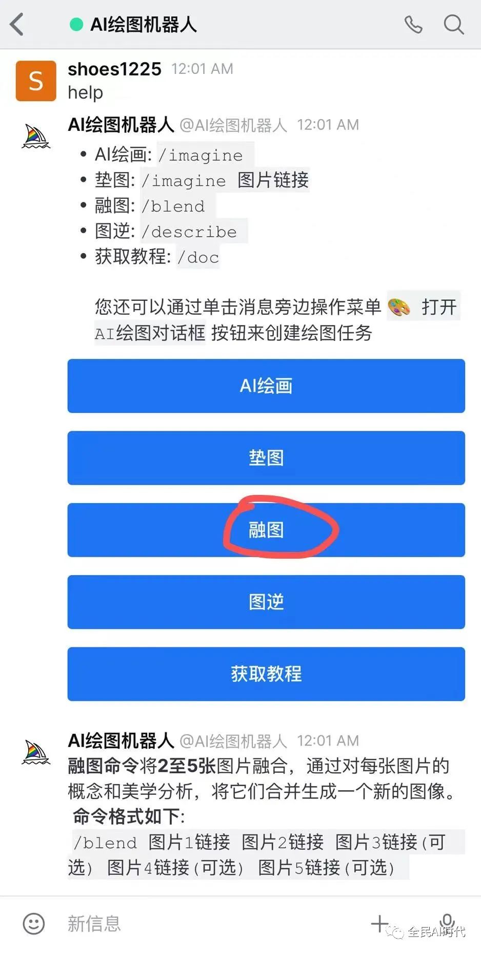 先在对话框中输入“/blend”,空格后输入想要融合的2~5张图片的图片链接,不同链接之间用空格隔开。获取图片链接的方法上文已述。