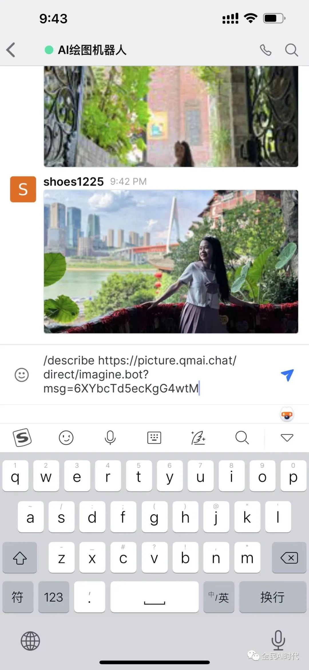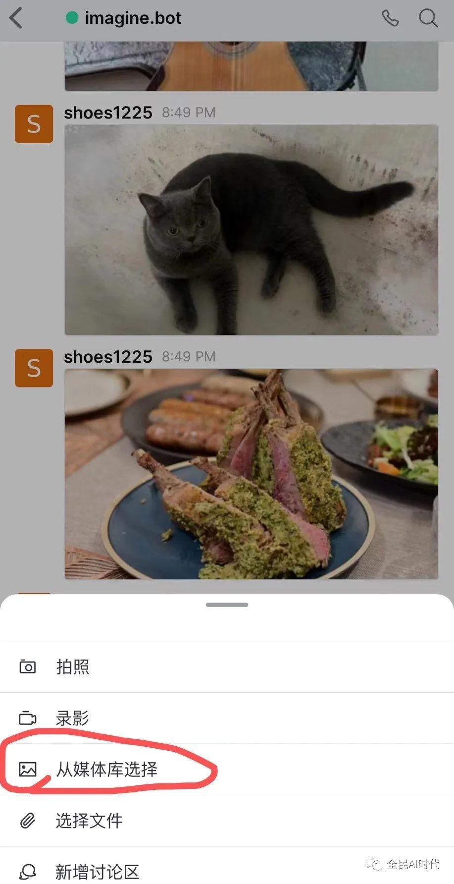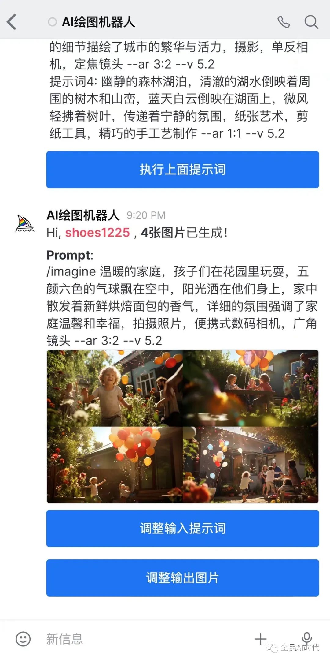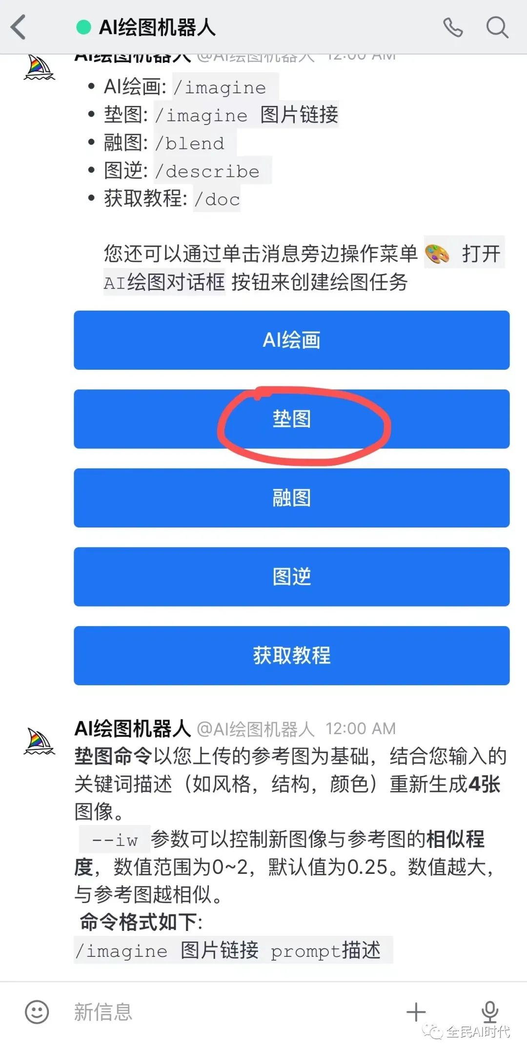 在聊天框中输入图片链接,空格,再输入描述词,发送,就会生成以此图片为参考图的四张图片。