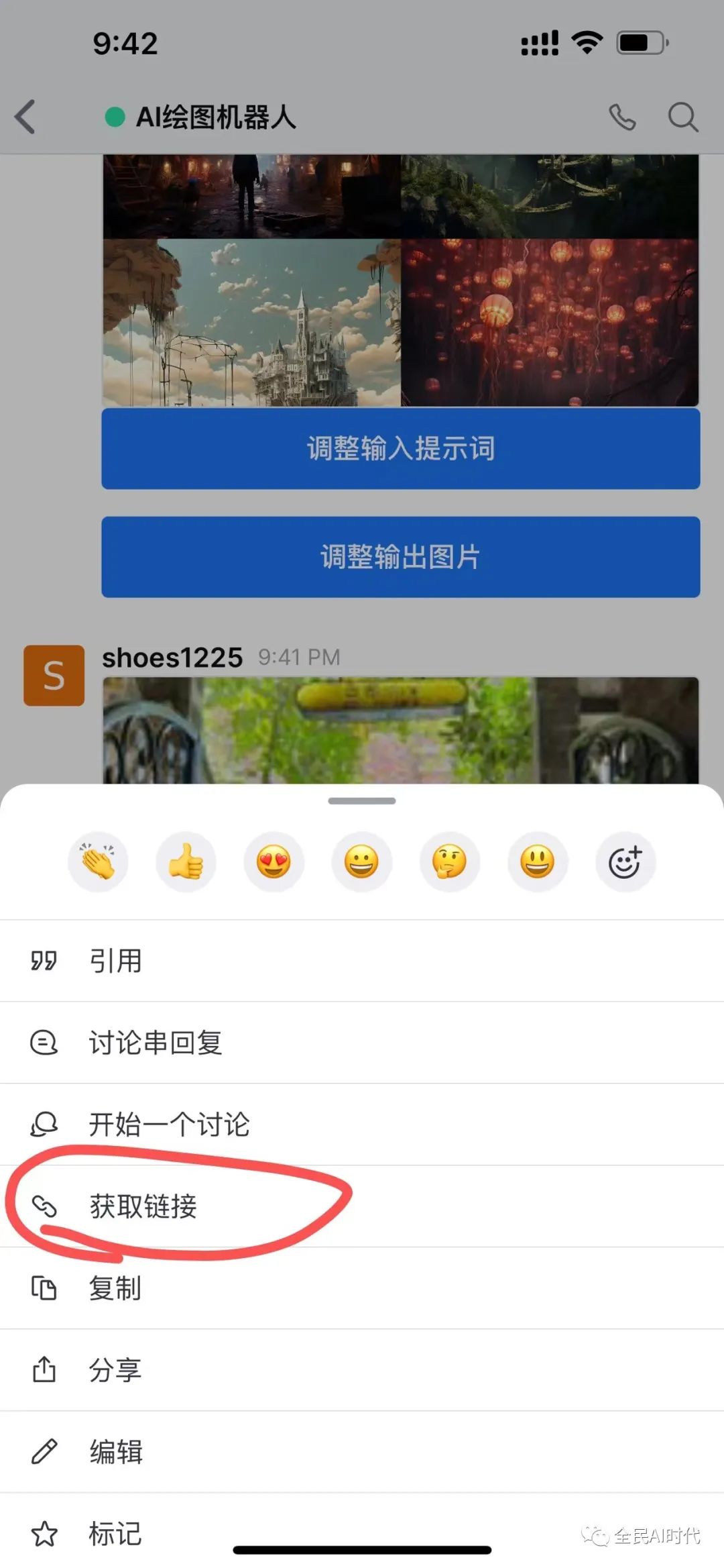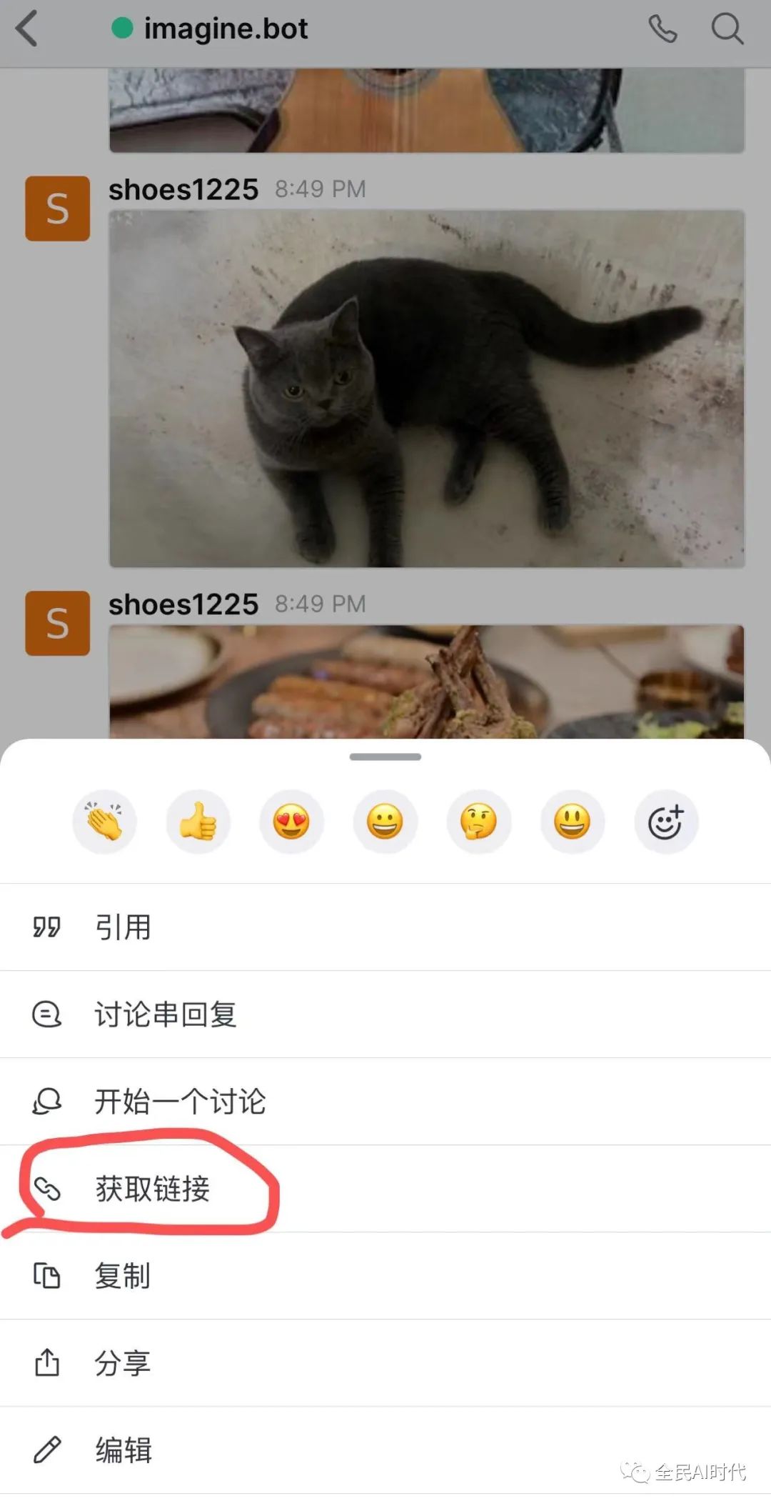 首先在聊天框上传一张图片,长按之后选择获取链接(上文已述)。然后输入命令: