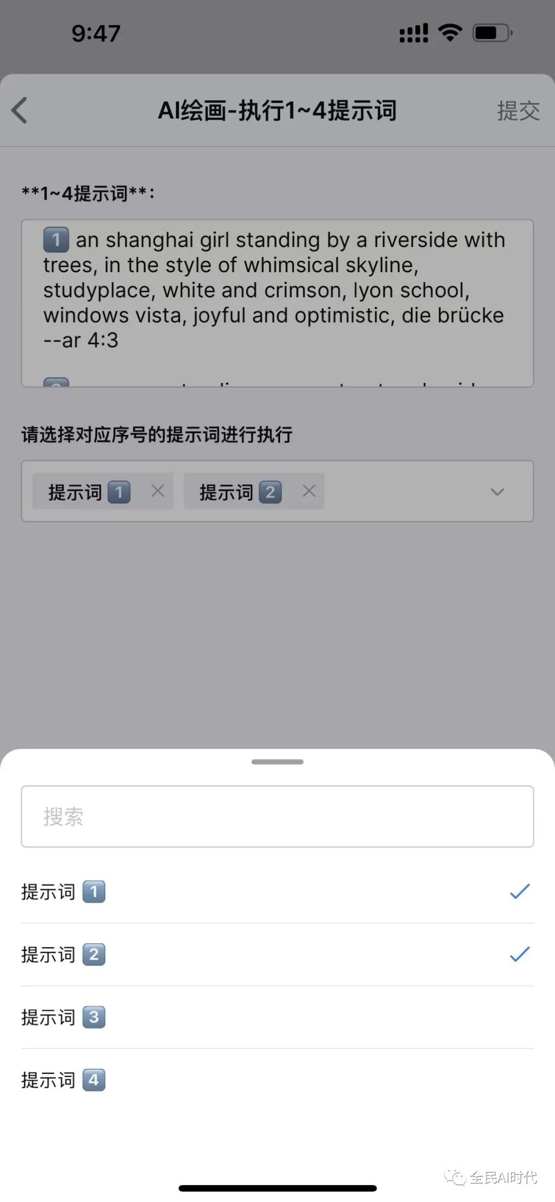 确认提交后,等待片刻便会生成与此主题相关的提示词。