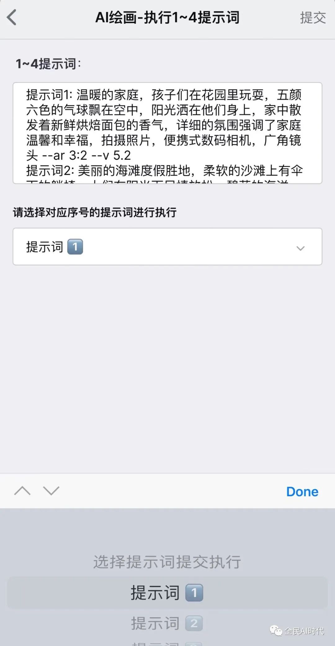 点击“执行上面提示词”,便可通过执行生成的提示词进行作画。例如选择“提示词1”。