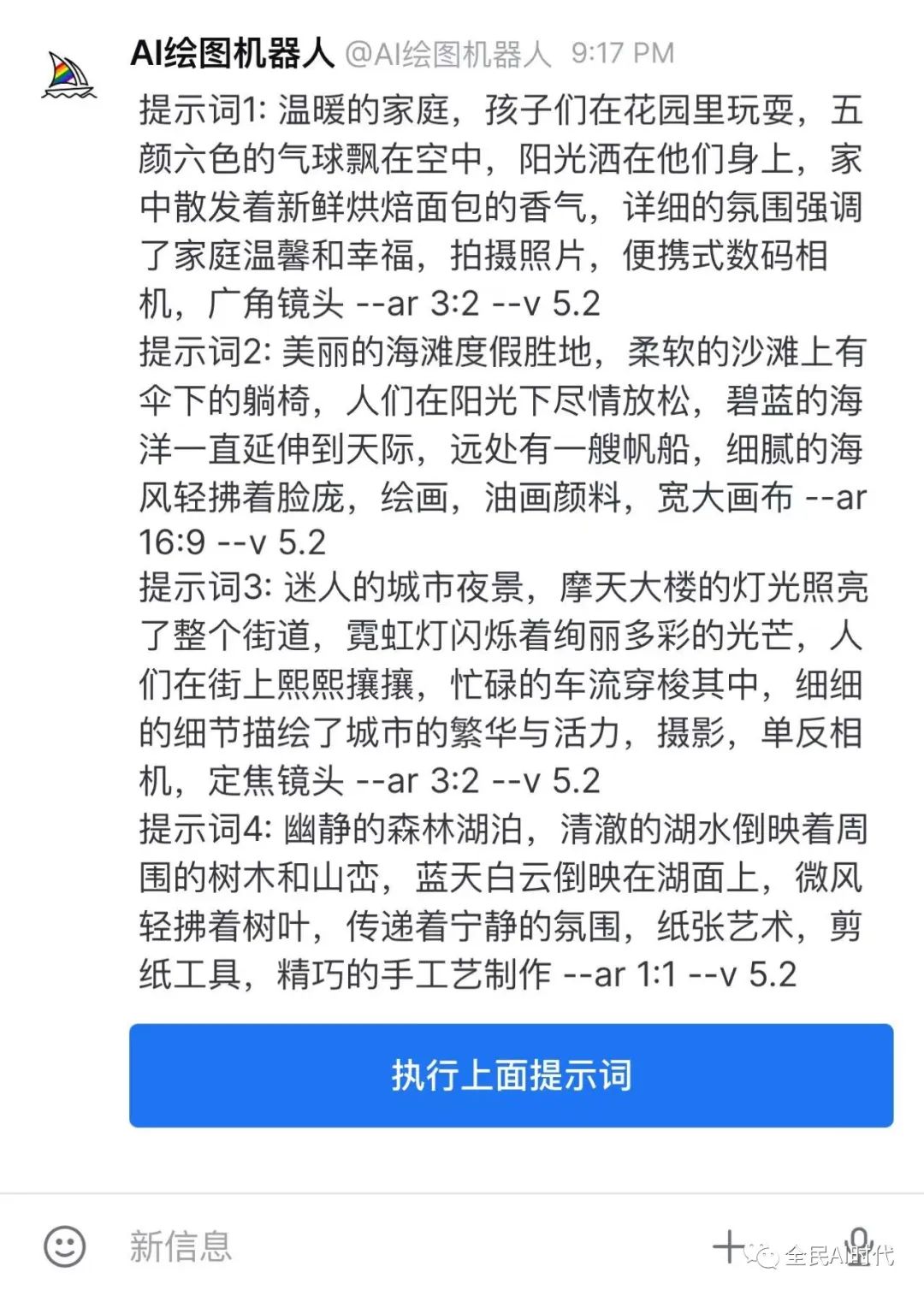 选择“执行上面提示词”。便可选择对应的提示词进行绘画。每个提示词都会生成四张对应的图片。