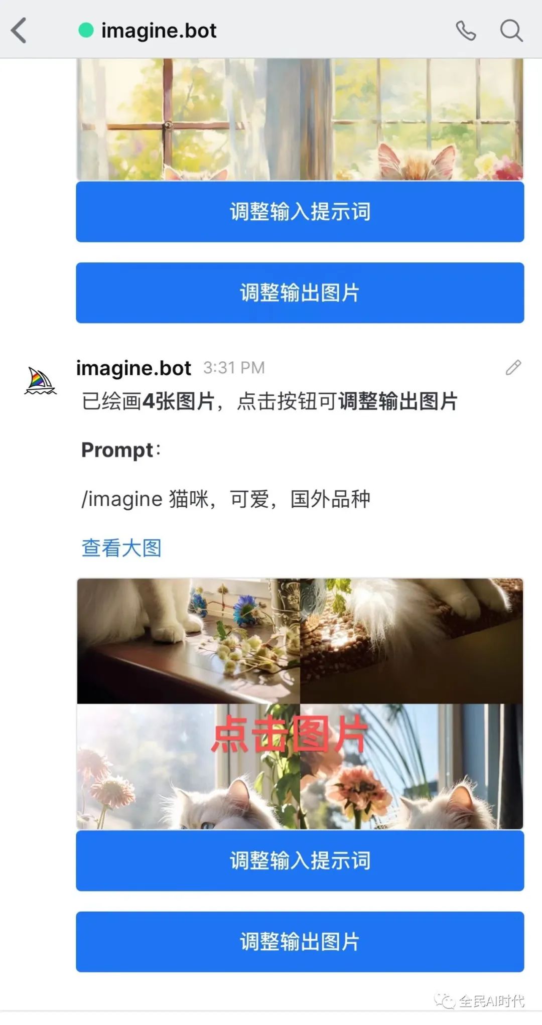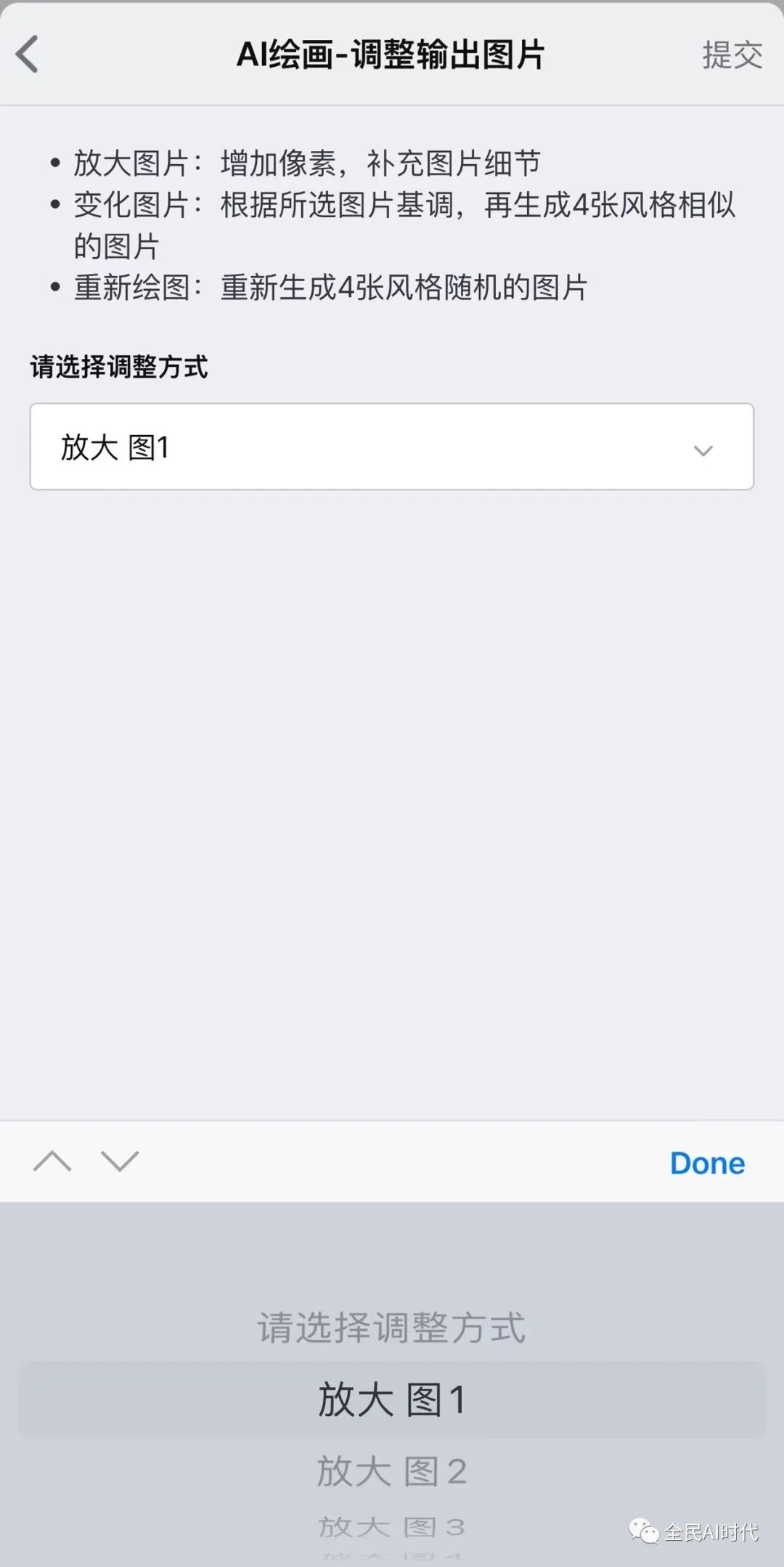 可通过图片下方“调整输入提示词”重新画图,“调整输出图片”来修改其中的某张图片。