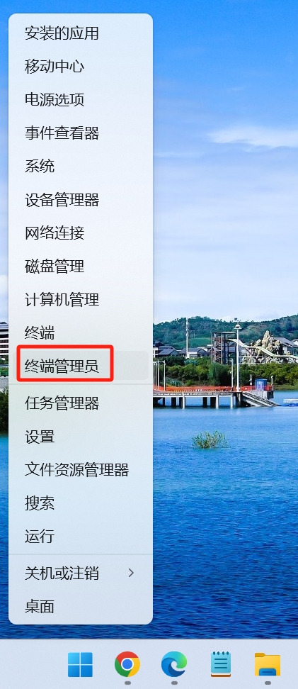 2、在弹出的菜单里点击终端管理员,也就是以前的DOS命令窗口