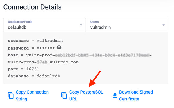 vultradmin1234host.vultrdb.com$ psql -h host.vultrdb.com -d postgres -U vultradminOr, copy and use your database connection string from your Vultr Managed Database for PostgreSQL control panel