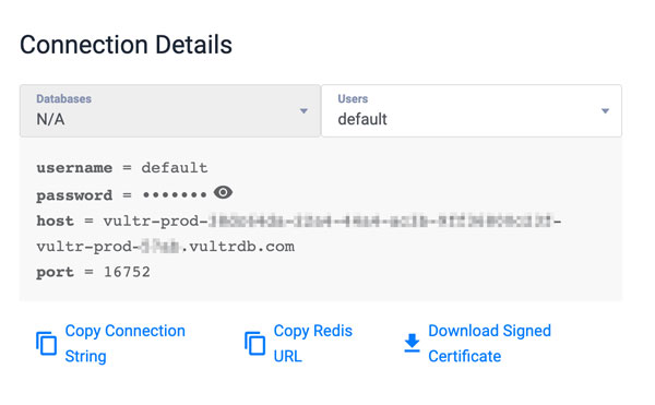REDIS_HOST=host.vultrd.com REDIS_PORT=1234 REDIS_USERNAME=admin REDIS_PASSWORD=strong-passwordYou can find your Vultr Managed Database for Caching details on your instance overview section