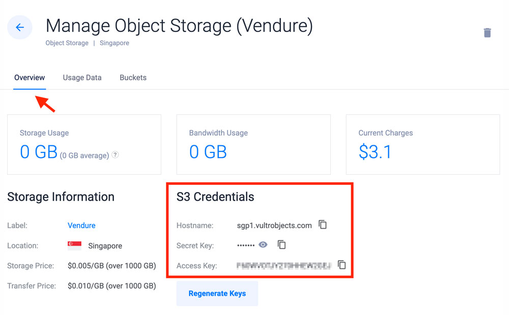 You can view your Vultr Object Storage details on the instance overview section