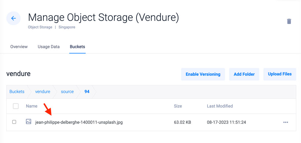 - 在 Vultr 客户门户会话中,查看 Vultr 对象存储桶。验证映像在存储桶中是否可用