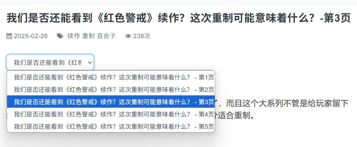 这是利用文章分页实现的。在编辑文章时,在需要分页的地方插入分页符#p#分页标题#e#即可。但默认的分页标题不能获取本篇文章的标题。所以本文介绍的就是把固定的分页标题修改为文章的标题。